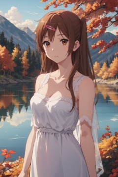 <lora:Shinka-000011:0.8>,Shinka CYQL,1girl,looking at viewer,solo,long hair,brown hair,one side up,brown eyes,hairclip,hair ornament,Strapless maxi dress with a lace overlay,drunk,upper_body,Autumn, Foliage, Lake, Reflection, Mountains, Colors, Serenity, Tranquility,(Wisteria vines, Garden party, Outdoor dining, Floral canopy, Summer celebration, English charm:0.5),beautiful detailed sky,beautiful detailed glow,posing in front of a colorful and dynamic background,masterpiece,best quality,beautiful and aesthetic,contrapposto,female focus,wallpaper,
