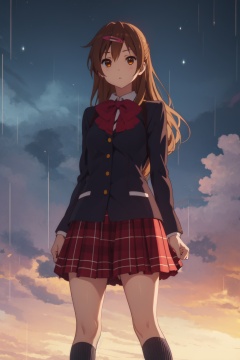 <lora:Shinka-000011:0.8>,Shinka CYQL,1girl,looking at viewer,solo,long hair,brown hair,one side up,brown eyes,hairclip,hair ornament,school uniform,skirt,plaid,plaid skirt,socks,kneehighs,blush,full_shot,Rainbow, Rain, Colors, Sky, Horizon, Beauty, Serenity, Magic,(Lavender rows, Purple blooms, Summer sunshine, Fragrant air, Lavender harvest, English countryside:0.5),beautiful detailed sky,beautiful detailed glow,posing in front of a colorful and dynamic background,masterpiece,best quality,beautiful and aesthetic,contrapposto,female focus,wallpaper,