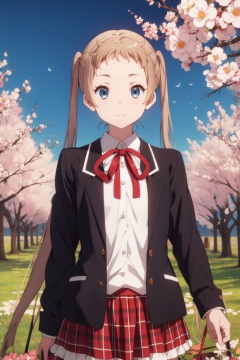 <lora:Sanae-000014:0.8>,Sanae CYQL,1girl,looking at viewer,solo,blonde hair,very long hair,long hair,twintails,brown hair,blue eyes,school uniform,ribbon,jacket,skirt,plaid skirt,plaid,smirk,upper_body,Orchard, Apples, Blossoms, Spring, Trees, Colors, Serenity, Harvest,(Bee balm, Coneflowers, Wild grasses, Beehives, Pollinators, Buzzing activity:0.5),beautiful detailed sky,beautiful detailed glow,posing in front of a colorful and dynamic background,masterpiece,best quality,beautiful and aesthetic,contrapposto,female focus,wallpaper,