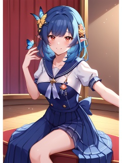 score_9,score_8_up,score_7_up,source_anime,BHqinshi,idol,<lora:BHqinshi-Vidol-000006:0.8>,1girl,hair ornament,red eyes,pointy ears,blue hair,medium breasts,bangs,butterfly_sitting,sailor_dress,seductive_smile,indoor,stage,front view,<lora:Pony_DetailV2.0:1>,<lora:Fixhands_anime_bdsqlsz_V1:1>,