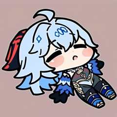 ((HRD, HUD, 8K)),((masterpiece, best quality)), highly detailed, soft light,EmojiPack, 1girl, ganyu (genshin impact), horns, chibi, blue hair, lying, on back, solo, ahoge, blush stickers, long hair, closed eyes, bangs, detached sleeves, bell, grey background, simple background, gloves, black gloves, <lora:20240527-1716802627504:0.9>