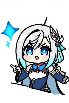 ((HRD, HUD, 8K)),((masterpiece, best quality)), highly detailed, soft light,EmojiPack, 1girl, shenhe (genshin impact), solo, long hair, blue eyes, bangs, chibi, hair ornament, braid, grey hair, sidelocks, chinese clothes, white background, pointing up, gradient, v-shaped eyebrows, detached sleeves, <lora:20240527-1716802627504:0.8>