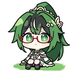 ((HRD, HUD, 8K)),((masterpiece, best quality)), highly detailed, soft light,EmojiPack, 1girl, solo, chibi, glasses, black hair, hair ornament, ponytail, white background, long hair, green hair, multicolored hair, bangs, simple background, green eyes, sitting, closed mouth, red-framed eyewear, <lora:20240527-1716802627504:0.8>
