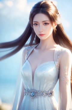 cowboy_shot,(Good structure), DSLR Quality, Masterpiece, (ultra wide angle lens: 1.2), Unity8k wallpaper, best quality, (detail shadow: 1.1), a beautiful girl, on a sea of light blue silk, translucent silk, floating light blue silk, surrealist style, minimalism, highly detailed texture, light blue, white clean background, CG rendering, light passing through clouds, 8k resolution, (motion photo: 1.2), (Fidelity: 1.4), original photos, movie lighting, 1girl,, , ((poakl)),kind smile,, weddingdress, zhangyuxi, nangongwan, NaGongWan,Xlimuwan