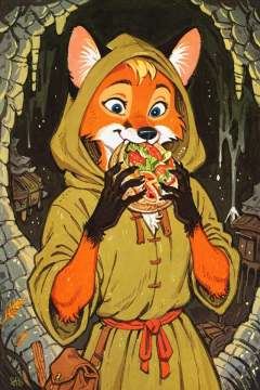 anthro fox girl,blonde hair,Robin Hood,(solo:1.5),cave,Trepenok,cape,hood,portrait, Eating boxed lunch<lora:Trepenok:0.8>  <lora:age_slider_v4:-3> <lora:Perfect Hands:1>, score_9, score_8_up, score_7_up, score_6_up, score_5_up, score_4_up,zPDXL