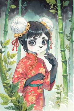 (anthro panda girl:1.4),(solo:1.5),double bun,black hair,ameli,looking at viewer,bamboo forest, deep dark night,chinese clothes,chinese commentary, portrait, watercolor \(medium\), fur paws,black eyes<lora:Perfect Hands:1> <lora:age_slider_v4:-2> <lora:Ameli:0.9>, score_9, score_8_up, score_7_up, score_6_up, score_5_up, score_4_up,zPDXL