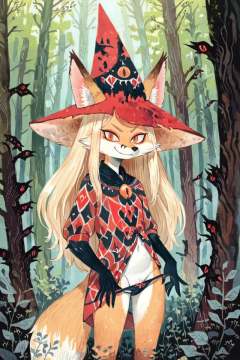 (anthro fox girl:1.4),(blonde hair:1.2),(solo:1.5),ameli,evil smile, forest,red witch outfit and hat,(cowboy shot:1.2), looking at viewer, panty_pull <lora:Perfect Hands:1> <lora:age_slider_v4:-1> <lora:Ameli:0.85>, score_9, score_8_up, score_7_up, score_6_up, score_5_up, score_4_up,zPDXL