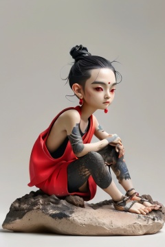 <lora:niantu-000007:0.9>,HDR,UHD,8K,Highly detailed,best quality,masterpiece,huayan,niantu,solo,jewelry,tattoo,black hair,earrings,sitting,red eyes,barefoot,1girl,looking at viewer,hair bun,forehead mark,rock,single hair bun,full body,grey background,child,**** top,makeup,forehead,red shirt,arm tattoo,anklet,toeless legwear,on ground,sleeveless,
