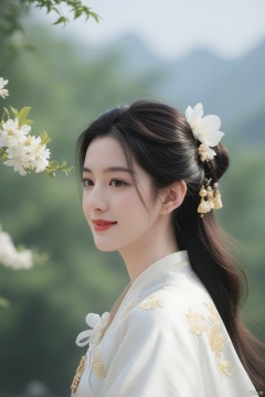 best quality, masterpiece,cowboy_shot,(Good structure),,a girl,xianjing,Off-the-shoulder, bust photo,upper body,Hanfu, Cloud, Smoke,branch,flower, smile,Gaze at the audience, Ink scattering_Chinese style, ((poakl)), ,looking_at_viewer,kind smile, , chinese dress,white dress, liuyifei,long_hair, Anne Hathaway,