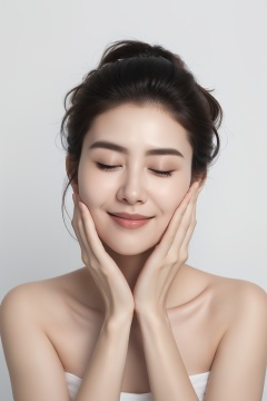 1girl, solo, smile, Disk hair, black hair, Portrait, bare shoulders, Front, Smile, closed mouth, realistic, hands on own face, white background<lora:yiling:0.65>