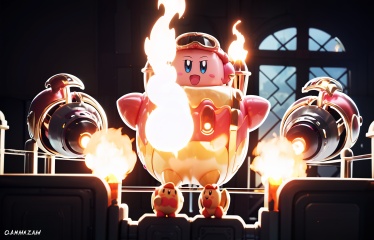 score_9, score_8_up, score_7_up, score_6_up, 8k, best quality, masterpiece, (ultra-detailed:1.1), good background, [<lora:TheUltimateShowdown-pony-Tanger-000005:0.8>::0.75], The ultimate showdown, player faces the boss, cg, running samll cute animal, fire, kirby, open mouth, no humans, indoors, a picture of a character in a video game, a big cartoon mario that has flames coming out of it,