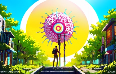 score_9, score_8_up, score_7_up, score_6_up, 8k, best quality, masterpiece, (ultra-detailed:1.1), good background, [<lora:TheUltimateShowdown-pony-Tanger-000005:0.75>::0.75], The ultimate showdown, player faces the boss, cg, l  outdoors, tree, scenery, lamppost, plant, building, 1boy, power lines, solo, colorful, pants, utility pole, standing, sun, sunset, wide shot, traffic light, tentacles, a colorful painting of a man standing on a bridge, an image that has an orange, purple, yellow, and blue background,