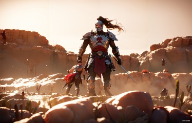 score_9, score_8_up, score_7_up, score_6_up, 8k, best quality, masterpiece, (ultra-detailed:1.1), good background, [<lora:TheUltimateShowdown-pony-Tanger-000005:0.75>::0.75], The ultimate showdown, player faces the boss, cg, multiple boys, outdoors, weapon, armor, standing, brown hair, a couple of people standing in a desert area, a scene of two people riding horses in the desert,