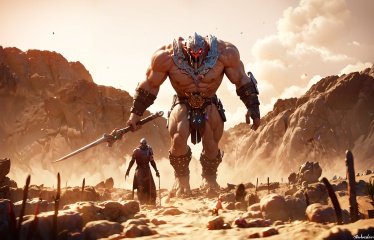 score_9, score_8_up, score_7_up, score_6_up, 8k, best quality, masterpiece, (ultra-detailed:1.1), good background, [<lora:TheUltimateShowdown-pony-Tanger-000005:0.75>::0.75], The ultimate showdown, player faces the boss, cg, outdoors, scenery, weapon, mountain, a painting of a giant monster in the desert, a large alien creature walking in the desert,