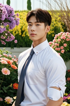masterpiece,1 Boy,Look at the audience,detailed gorgeous face,Muscular development,Shirt,Tie,in summer,Garden,Flowers,realistic,best quality,ccurate,