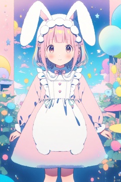 A woman wearing a fluffy bunny costume and big bunny ears, full body shot, wide angle, cute and childlike expression, professional portrait, ultra-fine 8K, high resolution, detailed facial features, detailed clothing, soft lighting, whimsical, fantasy, pastel colors, cute, loli,jjmx, Magazine cover