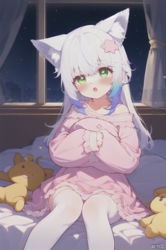 1girl, solo, long hair, looking at viewer, blush, open mouth, bangs, thighhighs, long sleeves, dress, animal ears, sitting, green eyes, purple hair, white hair, multicolored hair, sky, indoors, off shoulder, :o, white thighhighs, animal ear fluff, pillow, symbol-shaped pupils, fox ears, window, bed, gradient hair, night, feet out of frame, on bed, stuffed toy, star \(sky\), pink dress, night sky, pink shirt, character doll, loli