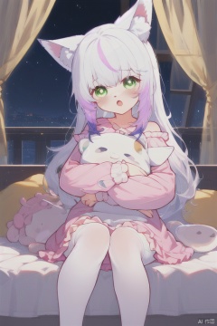 1girl,chibi,cute, solo, long hair, looking at viewer, blush, open mouth, bangs, thighhighs, long sleeves, dress, animal ears, sitting, green eyes, purple hair, white hair, multicolored hair, sky, indoors, off shoulder, :o, white thighhighs, animal ear fluff, pillow, symbol-shaped pupils, fox ears, window, bed, gradient hair, night, feet out of frame, on bed, stuffed toy, star \(sky\), pink dress, night sky, pink shirt, character doll, loli