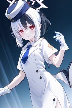 ((white dress)), short dress, pencil dress, gloves, hat, black hat, puffy sleeves, puffy short sleeves, short sleeves, white gloves, piercing, ear piercing, half gloves, earclip, uniform, garrison cap, necktie, kayokoUniform