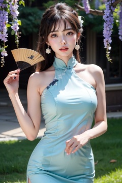 1girl, blurry, blurry_background, blurry_foreground, depth_of_field, motion_blur, hand_fan, bokeh, photo_\(medium\), solo, dress, chinese_clothes, black_hair, earrings, lips, 3d, photo_background, holding, focused, jewelry, wisteria, holding_fan, looking_at_viewer, photorealistic, china_dress,extremely detailed CG unity 8k wallpaper,masterpiece, best quality, ultra-detailed, beautiful detailed eyes:1.2,best illumination, (best shadow, an extremely delicate and beautiful, bloom),best quality, masterpiece, highres, original, extremely detailed wallpaper, perfect lighting,(extremely detailed CG:1.2), drawing, paintbrush,, , 1 girl