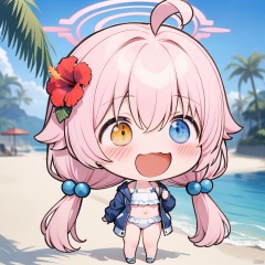 smile, :d, chibi,chibi, full body, (masterpiece),(best quality),solo, red flower, 1girl, hoshino (blue archive), flower, blue jacket, hoshino (swimsuit) (blue archive), hair ornament, white bikini, frilled bikini, heterochromia, swimsuit, twintails, long hair, ahoge, yellow eyes, bikini, navel, halo, blush, looking at viewer, jacket, frills, low twintails, blue eyes, open mouth, pink hair, collarbone, hair between eyes, hair bobbles, outdoors, long sleeves, hair flower, official alternate costume, hibiscus, open clothes, blurry