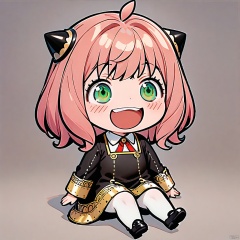 smile, :d, chibi,(masterpiece),(best quality),Anya Forger, 1girl, anya \(spy x family\), solo, female child, pink hair, green eyes, school uniform, eden academy school uniform, smile, dress, sitting, looking at viewer, open mouth, black footwear, black dress, child, shirt, :d, long sleeves, full body, shoes, medium hair, bangs, ahoge, white pantyhose, collared shirt