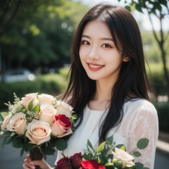 masterpiece,best quality,1girl,Ultra-realistic 8k CG,masterpiece,best quality,(photorealistic:1.4),HDR,absurdres,Professional,RAW photo,lens flare,(film grain:1.1),Bokeh,((Depth of field)),studio light,a woman in a red dress,a bouquet of roses and looking at the camera with a smile on her face,1girl,black_hair,bouquet,brown_eyes,dress,lips,long_hair,looking_at_viewer,smile,solo,Highly detailed,Professional,extreme detail description,