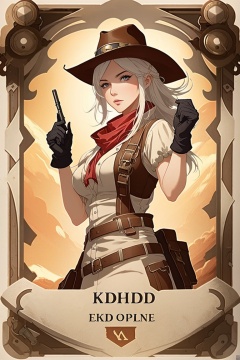 ((HRD, HUD, 8K)),((masterpiece, best quality)), highly detailed, soft light,Card, 1girl, solo, weapon, hat, gun, gloves, fingerless gloves, cowboy hat, long hair, goggles, holding weapon, brown gloves, holding, belt, short sleeves, breasts, red bandana, looking at viewer, goggles on headwear, white hair, upper body, holding gun, lips, steampunk, character name, nose, medium breasts, brown eyes, cowboy western, scarf, handgun, shirt, revolver, <lora:20240528-1716881484728:0.8>