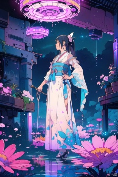 best quality, masterpiece, realistic,cowboy_shot,(Good structure), DSLR Quality,Depth of field,kind smile,looking_at_viewer,Dynamic pose, Surrealism Dream Style,glowing neon color,RAW photo,at night,1girl,solo,sea,black hair,ponytail,looking at viewer,long hair,up,lips,sash,water splaashing,hair ornament,realistic,wide sleeves,hanfu,long dress,Semi transparent gauze skirt,surrealist,Best quality,masterpiece,ultra high res,Petal skirt,wind,flowers,bloom,Clouds,smoke,neon lights,moyou