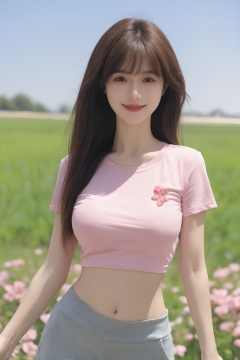 1girl, solo, outdoors, shirt, breasts, looking at viewer, brown hair, navel, flower, realistic, smile, pants, field, brown eyes, day, pink shirt, standing, long hair, sky, short sleeves, midriff, blurry, large breasts, yoga pants<lora:sifang_20231118123505:0.6>,