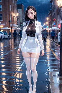 1girl, Wet clothes, Translucent clothes, 1girl, solo, long hair, breasts, looking at viewer, skirt, large breasts, shirt, black hair, thighhighs, long sleeves, brown eyes, jewelry, closed mouth, standing, jacket, earrings, outdoors, open clothes, shiny, miniskirt, white thighhighs, tree, lips, wet, see-through, night, white jacket, white skirt, wet clothes, skin tight, pencil skirt, rain, shiny clothes, arms at sides, road, wet hair, latex, lamppost, street