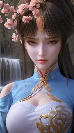 fqr,1girl,solo,blue chinese clothes,black hair,long hair,clothing cutout,cleavage cutout,looking at viewer,breasts,white long sleeved,closed mouth,forehead jewel,long sleeves,shoulder cutout,facial mark,realistic,flower field,sky,river,mizu,large breasts,white bra,,,waterfall,peach_blossom,high saturation,high_contrast,portrait,<lora:QYpifuV1:1>,<lora:玫瑰花场景-王导:0.6>