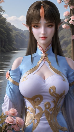 fqr,1girl,solo,upper body,blue chinese clothes,black hair,long hair,clothing cutout,cleavage cutout,looking at viewer,breasts,white long sleeved,closed mouth,forehead jewel,long sleeves,shoulder cutout,facial mark,realistic,flower field,sky,river,mizu,large breasts,white bra,,,waterfall,peach_blossom,high saturation,high_contrast,<lora:QYpifuV1:1>,<lora:玫瑰花场景-王导:0.6>