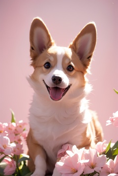 A doge with a tiny tail, a small nose, small ears, blue eyes, pink background, flowers, vases, dreams, open mouth, smile, Caroline Chariot-Dayez pastels, tumblr style, furry art, elokitty, Disney's Bambi dog, Disney's stylized furry, ears floating, fluffy tail, (fluffy:1.4), high resolution, furry art, The moon, small in size, mangguo_keji, <lora:YG可爱柯基:0.75>,
