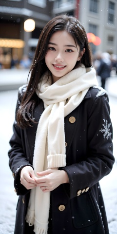 <lora:067_1+067_0.4+极致写实纯欲风初恋脸_0.3+极致写实纯欲风初恋脸2_0.1_0.2:0.2>,1girl,(snow:1.2),(snowing:1.2),snow,solo,scarf,long hair,smile,brown hair,bokeh,realistic,coat,blurry,