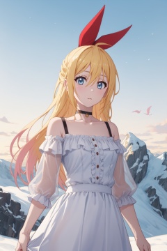 <lora:Chitoge-000008:0.8>,Chitoge CYQL,1girl,looking at viewer,solo,long hair,blonde hair,hair between eyes,ribbon,hair ribbon,red ribbon,hair bow,blue eyes,choker,Striped off-the-shoulder sundress with a smocked bodice,grin,upper_body,Glacier, Ice, Crevasse, Snowfield, Seracs, Mountaineers, Cold, Ice caves,(Meadow flowers, Butterflies, Wildflower carpet, Springtime blooms, English landscape, Meadow breeze:0.5),beautiful detailed sky,beautiful detailed glow,posing in front of a colorful and dynamic background,masterpiece,best quality,beautiful and aesthetic,contrapposto,female focus,wallpaper,