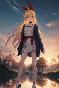 <lora:Chitoge-000008:0.8>,Chitoge CYQL,1girl,looking at viewer,solo,long hair,blonde hair,hair between eyes,ribbon,hair ribbon,red ribbon,hair bow,blue eyes,choker,Wrap-style Aran sweater worn over a bodycon skirt and heels,light_blush,full_shot,Marshland, Sunrise, Birds, Water, Reeds, Reflection, Serenity, Colors,(Orchids, Ferns, Palm trees, Epiphytes, Dense foliage, Humidity, Exotic birds:0.5),beautiful detailed sky,beautiful detailed glow,posing in front of a colorful and dynamic background,masterpiece,best quality,beautiful and aesthetic,contrapposto,female focus,wallpaper,