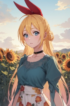 <lora:Chitoge-000008:0.8>,Chitoge CYQL,1girl,looking at viewer,solo,long hair,blonde hair,hair between eyes,ribbon,hair ribbon,red ribbon,hair bow,blue eyes,choker,Floral print smocked sundress with puff sleeves and a ruffled hem,laughing,portrait,Sunflowers, Field, Sky, Sunlight, Bees, Yellow, Horizon, Serenity,(Bluebells, Ferns, Oak trees, Fresh green leaves, Dappled sunlight, Woodland animals:0.5),beautiful detailed sky,beautiful detailed glow,posing in front of a colorful and dynamic background,masterpiece,best quality,beautiful and aesthetic,contrapposto,female focus,wallpaper,