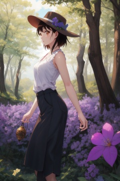 <lora:Kosaki-000013:0.8>,Kosaki CYQL,1girl,looking at viewer,solo,brown hair,short hair,asymmetrical hair,brown eyes,Wide-brim hat, **** top, palazzo pants, sandals,evil smile,profile,Forest, Bluebells, Trees, Flowers, Spring, Colors, Serenity, Beauty,(Enchanted trees, Fireflies, Glowworms, Magic atmosphere, Twilight hues, Whispers of the forest:0.5),beautiful detailed sky,beautiful detailed glow,posing in front of a colorful and dynamic background,masterpiece,best quality,beautiful and aesthetic,contrapposto,female focus,wallpaper,