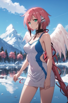 <lora:Ikaros-000009:0.8>,ikaros cyql,1girl,looking at viewer,solo,pink hair,long hair,very long hair,twintails,robot ears,hair ribbon,green eyes,collar,metal collar,chain,wings,angel wings,large breasts,sleeveless sheath dress with statement earrings and a clutch.,drunk,panorama,Formed by melting glaciers, these lakes boast a unique azure hue, framed by surrounding snow-capped peaks. Their surfaces mirror calmness, reflecting blue skies and white clouds,(Cherry blossoms, Pagoda, Koi pond, Cherry blossom festival, Japanese tranquility, Cherry blossom petals:0.5),beautiful detailed sky,beautiful detailed glow,posing in front of a colorful and dynamic background,masterpiece,best quality,beautiful and aesthetic,contrapposto,female focus,wallpaper,