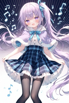 (masterpiece),(best quality),[Artist chen bin],[Artist onineko],loli,1girl,solo,purple eyes,long hair,pantyhose,ribbon,smile,open mouth,skirt,hair ribbon,plaid,plaid skirt,musical note,looking at viewer,black pantyhose,:d,capelet,side ponytail,eighth note,treble clef,striped background,very long hair,bangs,purple hair,blush,