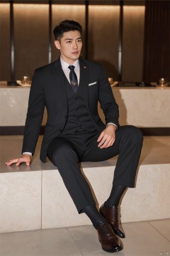 jzns,1man,male focus,asian,exquisite facial features,handsome,formal suit,necktie,pants,(sheer socks),footwear,sitting,Volumetric lighting,blurry,full shot,masterpiece, realistic, best quality, highly detailed, Ultra High Resolution,profession, zuk