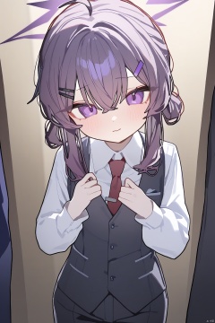 necktie, hairclip, collared shirt, pants, vest, formal, red necktie, black vest, white shirt, long sleeves, sidelocks, suit, ahoge, harukaSuit,