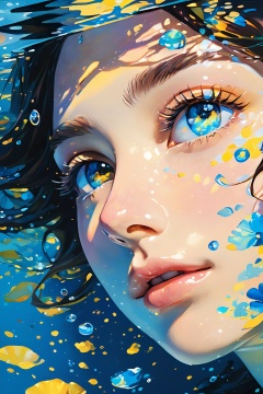 girl swims underwater,hyper detailed render style,glow,yellow,blue,brush,surreal oil painting,shiny eyes,head closeup,exaggerated perspective,tyndall effect,water drops,mother of pearl iridescence,holographic white,black background, <lora:20240510-1715326285381:0.7>