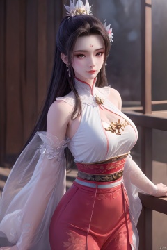 Xbaihehuai,masterpiece,(best quality),official art, extremely detailed cg 8k wallpaper,((crystalstexture skin)), (extremely delicate and beautiful),highly detailed,1girl,solo,long hair,headwear,,(black hair),(closed mouth),(standing),(chinese clothing),dress,Headwear, jewelry,,looking at the audience,Facing the camera,indoor,Street, Sunny,(whole body),looking_at_viewer, (big breasts), upper body,Xbaihehuai, ty-hd, desert_sky,X-Hydrangea
