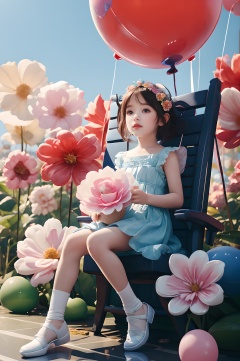 baby,3 years old,female children,<lora:Balloon Flowers_V10:0.6>,(sitting on a balloon),blooming flowers,(((the huge flower contrasts with the tiny girl))),middle of stamens,balloon flower,balloon,dream scene,CAD,unreal engine,shoes, <lora:Balloon Flowers_20231120130603:0.7>