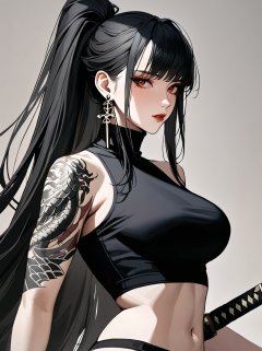 1girl,solo,long hair,looking at viewer,large breasts,black hair,red eyes,jewelry,very long hair,upper body,ponytail,sidelocks,earrings,midriff,sword,from side,crop top,tattoo,turtleneck,cross,katana,dragon,arm tattoo,eastern dragon,realisticmasterpiece,newest,absurdres,sensitive,very aesthetic,<lora:fashigirl-v2-sdxl:0.7>,