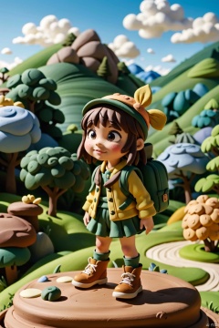 xinchaoniantu,,solo,girl,(clay wind:1.3),backpack,blue sky,(clay fold:1.2),anime clay,mountaineering,forest,anime,animation,clay material,rich background,HD,C4D,rich in details,depth of field