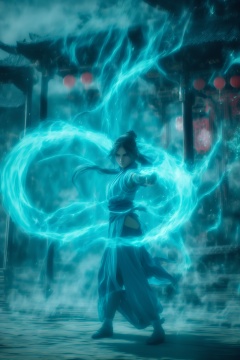 fighting stance,dancing,ancient-costume,cyan-aura,using cyan-magic,cyan-magic,1girl,solo,long hair,blue eyes,<lora:magic_fighting_cyan_512_dreamshaper_8_3:1>,