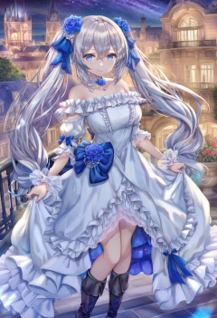 masterpiece, best quality,1girl, solo, dress, long hair, white dress, boots, white hair, flower, very long hair, looking at viewer, standing, full body, twintails, blue flower, blue eyes, black footwear, bare shoulders, high heels, sky, outdoors, knee boots, frilled dress, ribbon, frills, off shoulder, closed mouth, hair ribbon, choker, hair ornament, blue ribbon, star \(sky\), detached sleeves, starry sky, sleeves past wrists, rose, high heel boots, off-shoulder dress, night, smile, skyscraper, building, blue rose, night sky, hair between eyes <lora:torinoXLlokr8f-000182:0.95>